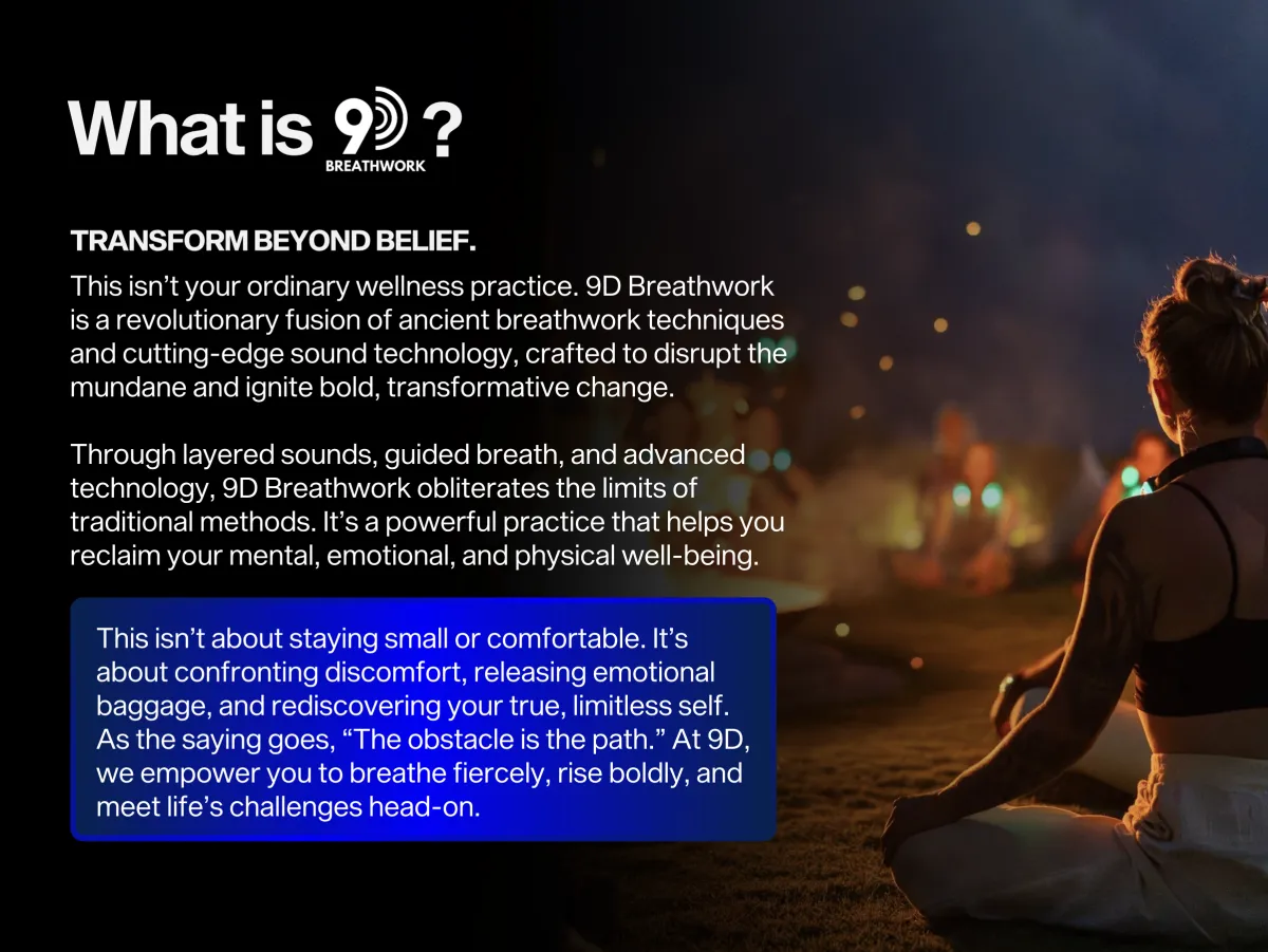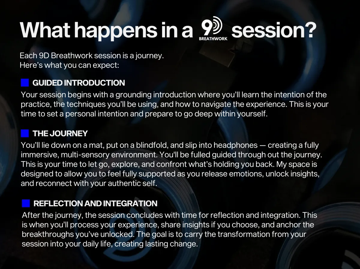 My experience in the 9D breath work journey was nothing what I expected but everything that I needed. I went into this journey with an open mind. I wanted to get the most out of this experience. To feel what was meant to be. It blew every expectation I had out of the water. During the 9D breathing session, what resonated most with me was the profound connection I felt between my mind and body. The combination of focused breathing, ambient sounds, and visual elements created an environment that allowed me to dive deep into my own awareness. It was as if I was peeling back layers of stress and tension, revealing a sense of inner peace.